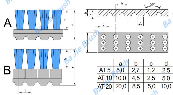 私たちの タイミングベルトブラシ PU歯付きベルトとブラシで構成されており、垂直方向と水平方向の清掃が必要な用途に適しています。ブラシは6種類の標準ベルトプロファイルからお選びいただけます。